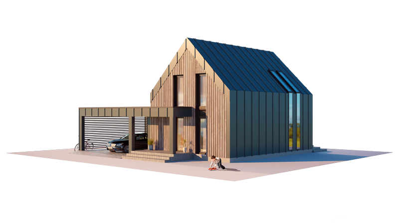 Nedidelis, tačiau ypatingai jaukus, keliantis nostalgiją – žodžiai, geriausiai apibūdinantys šį modulinį namuką. Dviejų aukštų pastato plotas yra 79,74 kv. m, visas jo išplanavimas nuosekliai apgalvotas siekiant integruoti poilsio ir laisvalaikio erdves. Viršutinio aukšto erdvėse numatyta nedidelė poilsio zona, miegamasis su drabužine ir sanitariniu mazgu. Apatinio aukšto patalpos pritaikytos aktyviam gyvenimui – jose suprojektuota svetainė sujungta su virtuve, numatytas darbo, svečių arba vaikų kambarys, drabužinė ir kitos techninės patalpos. Be to, visuomet turėsite vietą automobiliui – šalia namo yra stoginė, kurioje tilps net keli šeimos automobiliai.